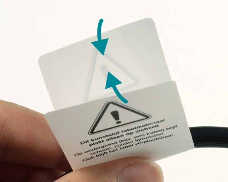 Een bijkomend voordeel van deze labels is dat ze verplaatsbaar zijn na aanbrenging. Omdat ze alleen aan zichzelf hechten en niet aan de ondergrond, kun je het label eenvoudig verschuiven naar een andere positie. Bijvoorbeeld om het label beter in het zicht te plaatsen.