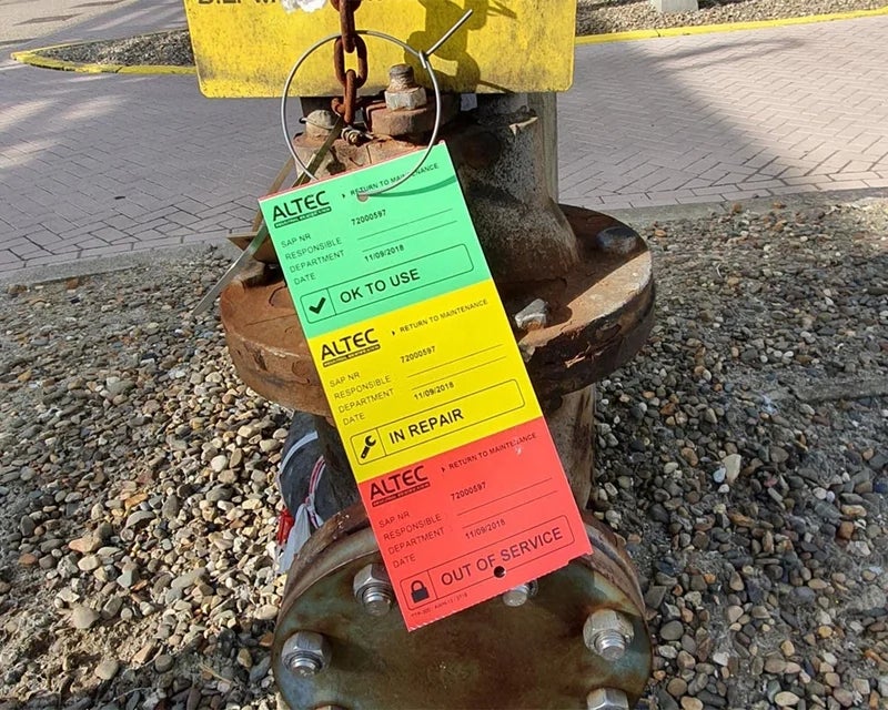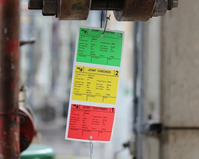 Flenstags | 100 x 228 mm | Groen / Geel / RoodDe revisietag print je in eigen beheer. Deze tag vind je vooral aan flensverbindingen die regelmatig om inspectie, reparatie of revisie vragen. Door het gebruik van kleur is de status van de flensverbinding in één oogopslag zichtbaar. Dit minimaliseert de kans op misverstanden of ongelukken.
