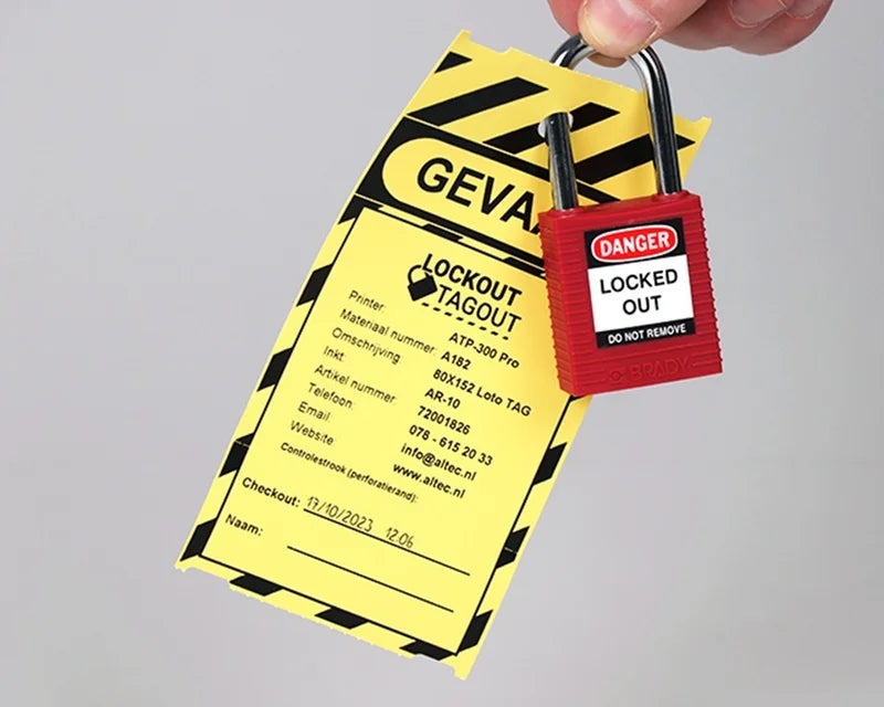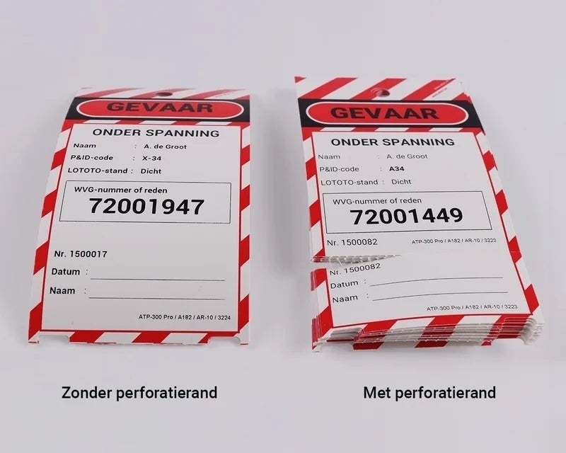LOTOTO Tag | 80 x 152 mm | Wit / Rood / Zwart | Met perforatieDe LOTOTO Tags zijn bedoeld voor onder meer Lockout Tagout toepassingen. Dit is de veiligheidsprocedure waarbij machines en/of andere krachtbronnen worden uitgeschakeld voor onderhouds- en herstelwerkzaamheden. Doordat de inhoud van deze tag volledig zelf in te vullen is, is het mogelijk verschillende meldingen en statussen aan te geven. Denk hierbij aan het type waarschuwing, naam van de verantwoordelijke, datum, P&ID-code, LOTOTO-stand en overige informatie.