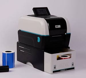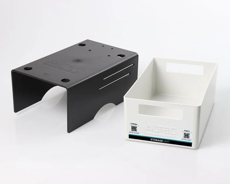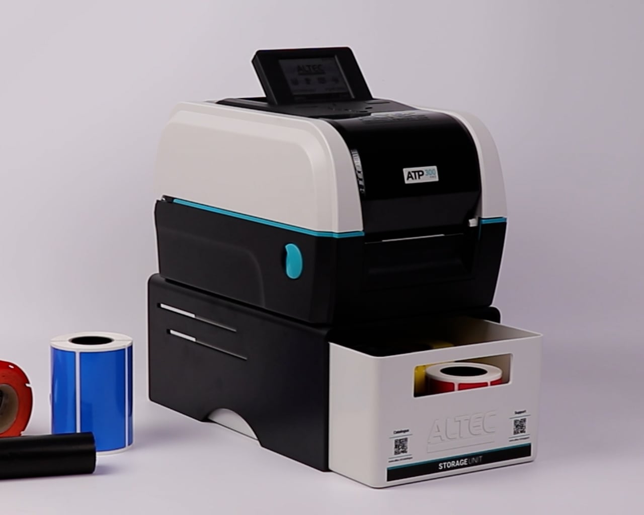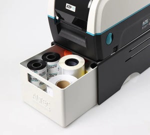 De ATP Storage Unit bestaat uit een zwart U-vorm platform met een witte lade. Te gebruiken voor opslag van labelmaterialen of als opvangbak voor afgeknipte labels. Ook het afscheuren van labels is eenvoudiger doordat de printer hoger staat.